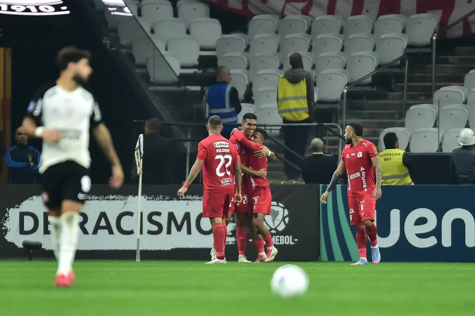 Apesar do domínio do Corinthians, foi o América de Cali quem abriu o placar aos 25 minutos do primeiro tempo. Em uma jogada de velocidade, o atacante Santiago Moreno recebeu na entrada da área e bateu forte, sem chances para o goleiro Cássio. O gol foi um balde de água fria para a torcida corintiana, que lotou a Neo Química Arena e esperava uma vitória tranquila.