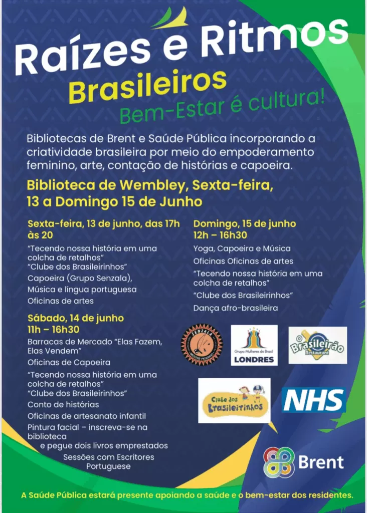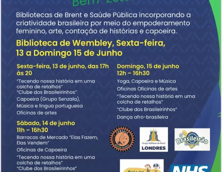 Nos dias 14 e 15 de junho, a Biblioteca de Wembley será o centro das atenções para todos os amantes da cultura brasileira. O evento Raízes e Ritmos – Bem Vindos ao Brasil promete trazer um pouco do sabor, da música e da alegria que são tão características do nosso país para a cidade de Londres. Com o apoio do Conselho de Brent, essa celebração será ainda mais especial e significativa para a comunidade brasileira que vive na capital britânica.