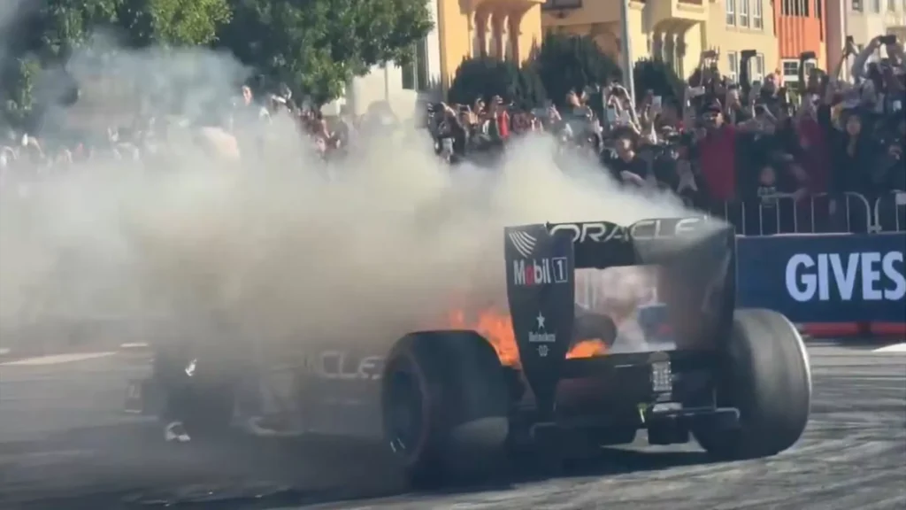 Exibição nos Estados Unidos terminou abruptamente com Tsunoda ainda dentro da viatura na altura do incêndio.